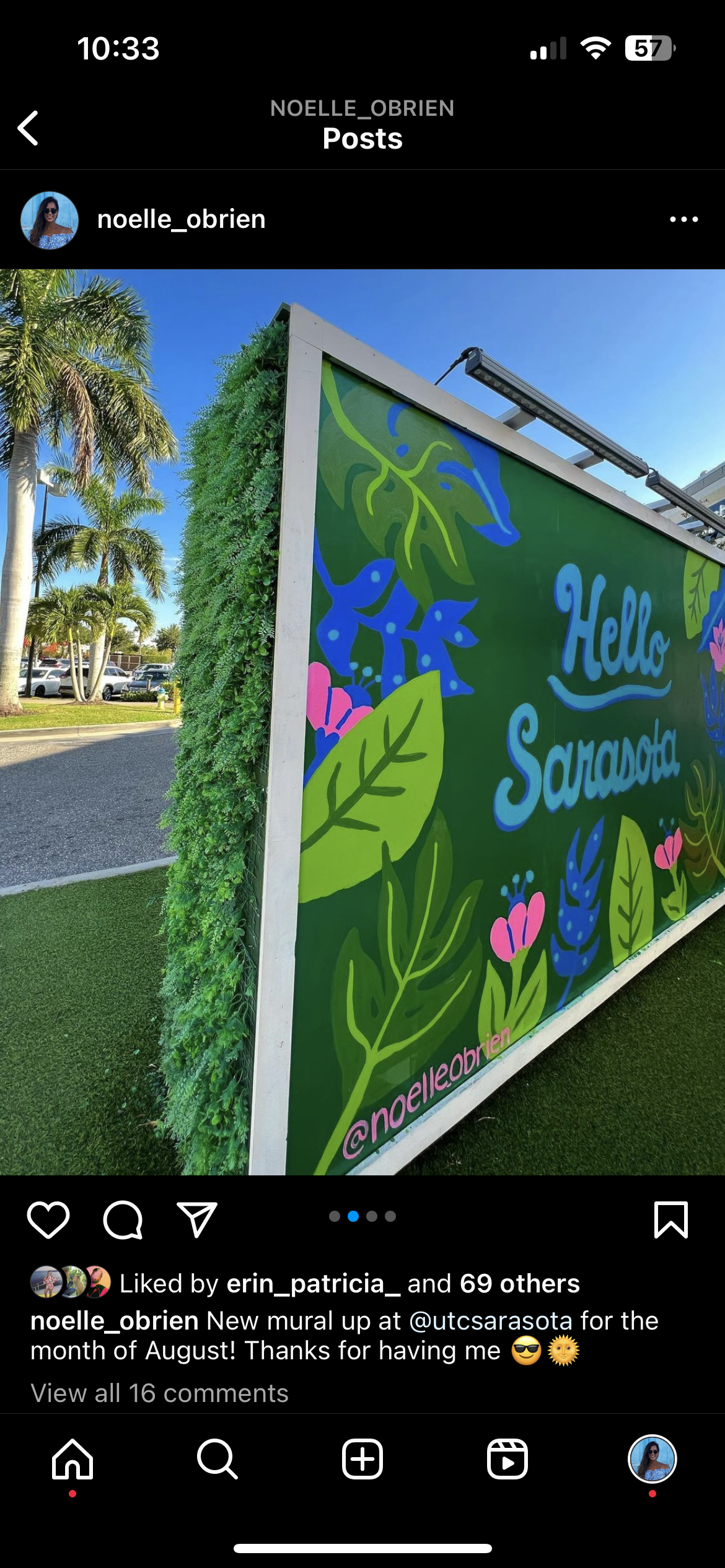I was hired by Benderson Development to design and paint a mural for them in a high-profile area at the University Town Center Mall in Sarasota, Florida. I concepted and designed the mural with tourists and Sarasota local engagement in mind. The Florida botanicals were custom illustrated and “Hello Sarasota” I hand lettered to encourage by-goers to have fun and take selfies with the mural — perhaps after grabbing a cone next door at Jeni’s Splendid Ice Cream, or a having bite at Blaze Pizza.